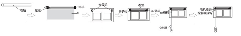 1. 準備Φ40mm卷軸, 長度=總長-25mm,卷軸內外邊緣毛刺清理干凈, 確保卷軸內壁清潔。2. 將尾塞、布、電機裝入卷軸內。3. 將安裝碼固定于墻上。4. 把卷軸裝入安裝碼上。5. 將M2504EB控制器與M2504EB電機的對接口的公母插對接。6. 將M2504EB控制器掛鉤掛入M2504EB電機掛鉤內。